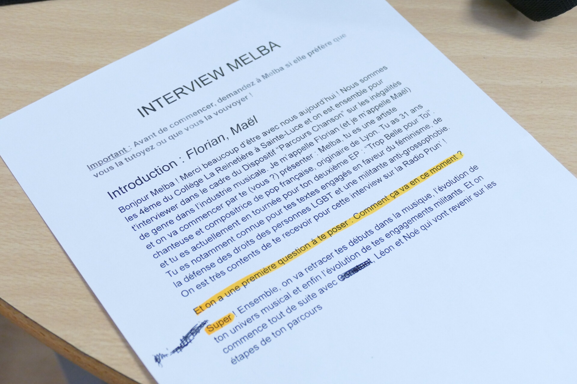 Prun' a initié la classe à l'entretien journalistique et à l'écriture de chroniques tandis que de leur côté, les élèves ont analysé les textes de Melba avec leur professeure de français. Une partie de la classe a pu interview l'artiste pendant près d'une heure sur son parcours, son univers musical et ses engagements militants.